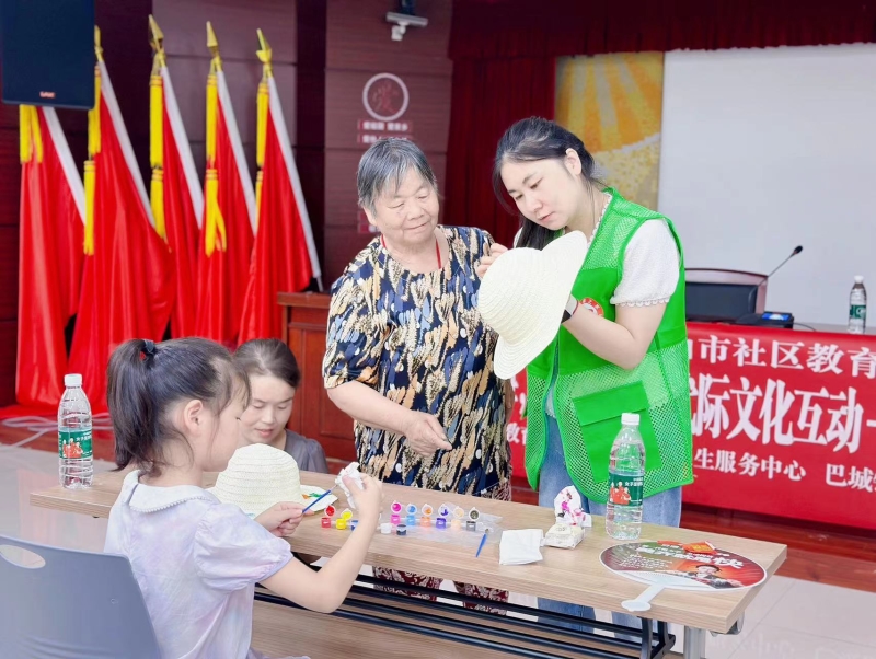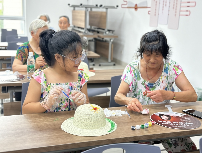 活动现场,聆听了来自不同家庭的快乐瞬间后,志愿者老师带领大家一起进行代际文化互动草帽DIY。孩子们在志愿者老师的带领下,对自己的草帽进行了艺术创作。志愿者老师鼓励孩子们大胆下笔,用自然的创造描绘出专属的DIY草帽,同时,邀请孩子们的祖辈一同参加,和孩子们一起装饰、描绘,并见证平凡无奇的草帽经过亲手描绘装饰,成为独一无二的作品。一老一少两代人,一只画笔、一顶草帽、一起构思、一起绘制,在合作的画笔下草帽焕发新的光彩,也享受着只属于他们的静谧时光。周阿姨在现场告诉我们,她和小孙女共画的是夏天的西瓜,是小孙女夏天最喜欢吃的水果,是属于他们全家最爱的水果。小孙女平时很喜欢画画,所以听说了“绘草帽”的活动,就积极报名和小孙女一同来参加。