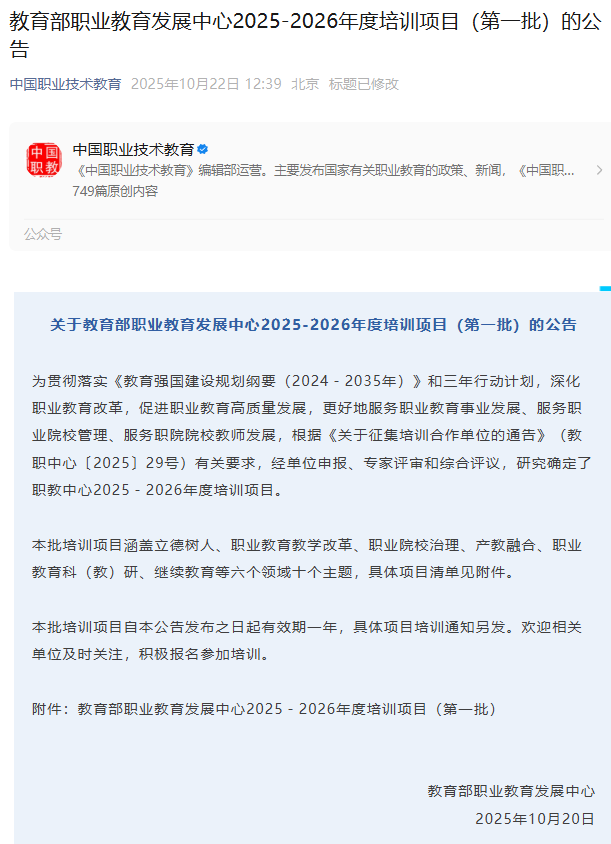 10月22日,教育部职业教育发展中心正式公布了2025-2026年度培训项目(第一批)名单。我校凭借其在学习型城市建设和继续教育领域的创新实践成果,成功获批承办“学习型城市建设与继续教育创新实践专题培训班”,成为本批十大主题培训项目中的重要一员。