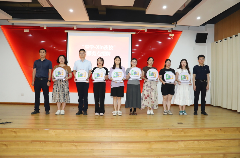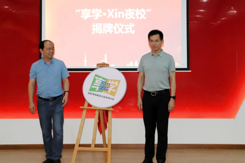 ▲市委教育工委委员、市开放大学党委书记徐健与保税区城乡发展局副局长毛东兴,共同为“享学·Xin夜校”揭牌。