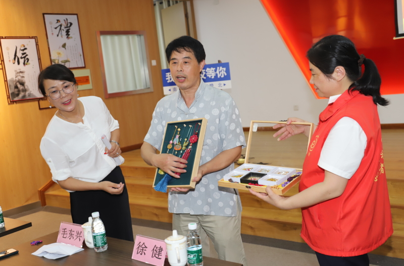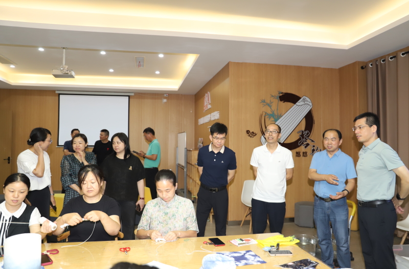 与会领导与居民一同观摩体验夜校第一课——扎染艺术的魅力。